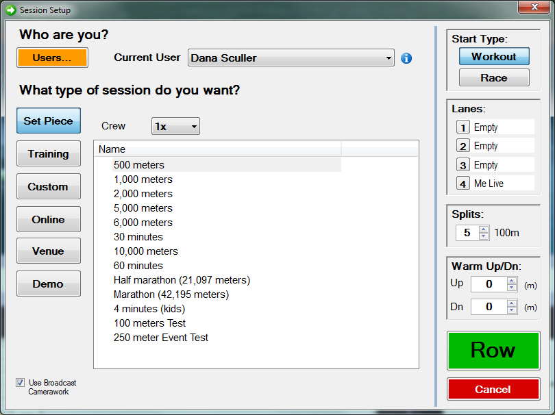 • Set Piece:   Your choice of preset rows from 500m to full marathon